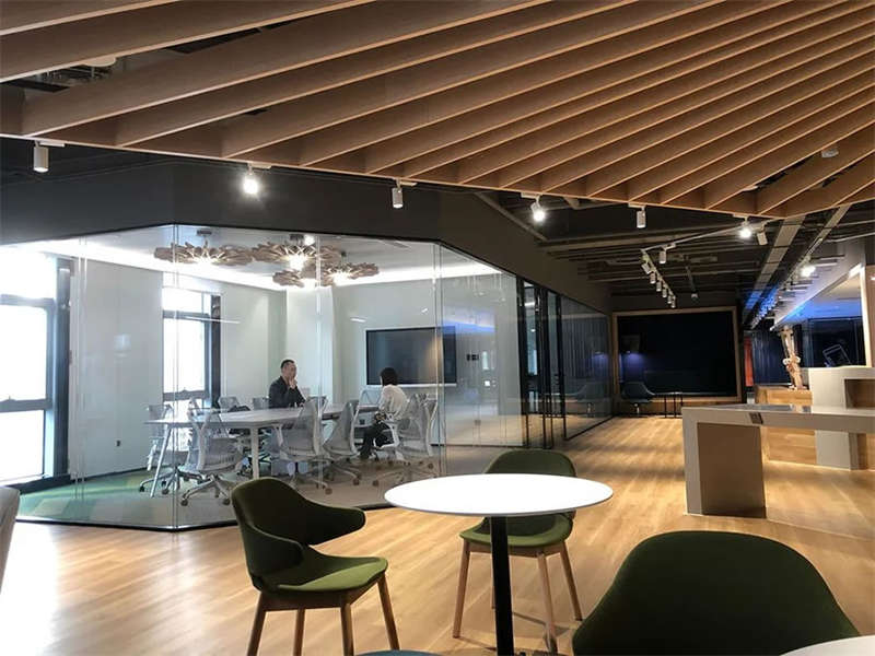 材料運用上,采用一系列天然、可再生和低排放的節(jié)能措施和材料,讓員工感受到與自然的聯系,同時提供了室內聲學舒適度。還采用了公司貿易產品——玻璃,各種玻璃的運用,充分體現了企業(yè)性質及對玻璃加工工藝的理解,既作為裝飾材料,也讓辦公區(qū)各個區(qū)域都成了產品展示區(qū),電梯廳和門廳運用了黑色背烤漆蒙砂玻璃,電梯廳頂部運用黑色銀鏡腐蝕雕刻形成總部辦公地所在的區(qū)域地圖,其他區(qū)域也充分將壓花玻璃、幕墻玻璃、淋浴隔斷玻璃及辦公高隔玻璃等進行了充分展示。