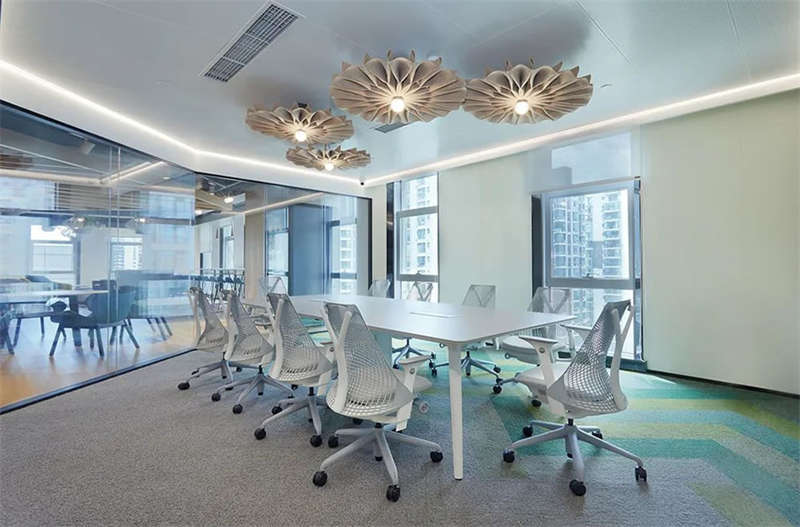 在空間規(guī)劃設計上,進行了動靜分區(qū),并打破了原有的動線,路線上進行了延伸、切角設計。在規(guī)劃各個功能空間中,充分考慮到建筑外光線與景觀的因素,將最好的光線位置留作員工咖啡交流及健身區(qū),將最好的視野區(qū)域作為總部接待大會議室。充分利用自然光,向員工傳遞正能量,其中亮點是每一個部門之間都設計了開放或半通透的多功能交流區(qū)域。讓員工參與互動活動、討論或組織公司活動,這種輔助辦公空間充足的情況下,有助于緩解員工工作中的所有壓力,幫助他們度過閑暇時光。