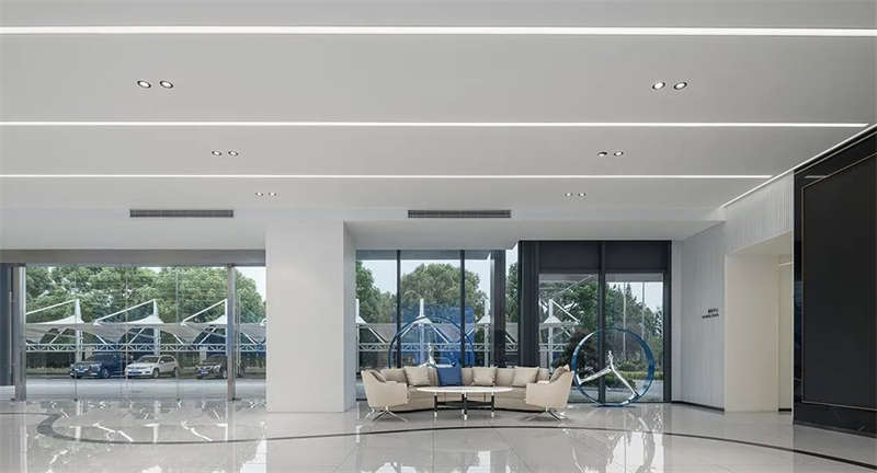 前廳頂部,鏡面質感與光帶反射,使空間得到延伸、重疊呼應,營造出多維的視覺效果,同時打破科技辦公室設計的刻板印象,擁有寬敞開放的前臺設計、待客區,層次、質感、豐滿而厚重。