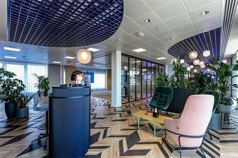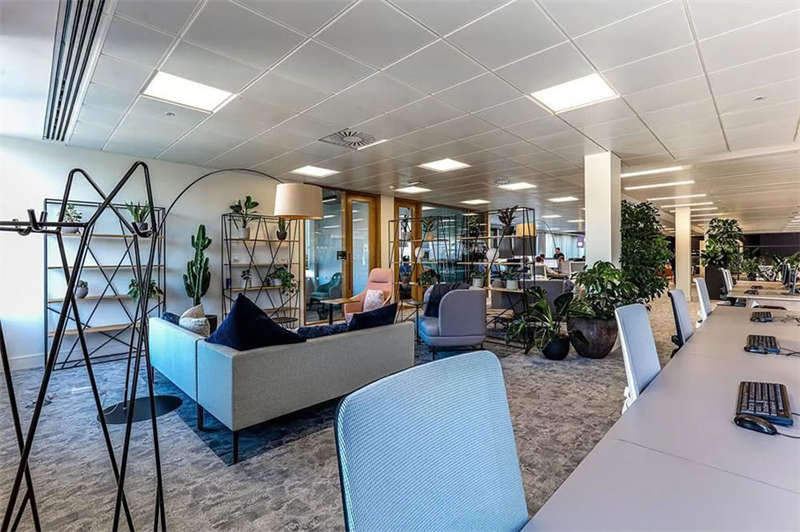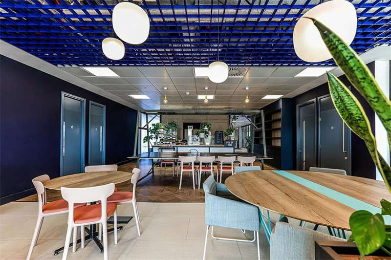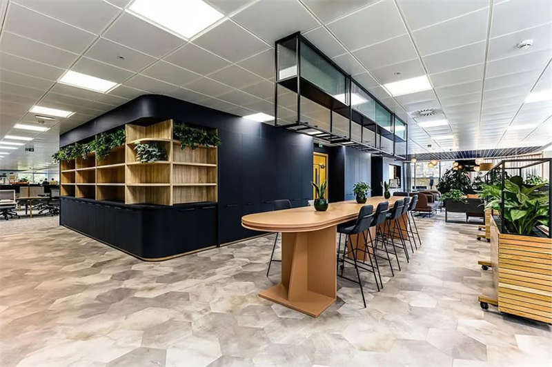 此番改造的一個(gè)重要主因是給到員工愿意回歸辦公室的理由。這意味著提升整體設(shè)施的實(shí)用性和美觀性,同時(shí)增加協(xié)作空間并整合遠(yuǎn)程工作人員的需求。因此對當(dāng)代前沿科技的投資成為關(guān)鍵要素。為了支持混合工作模式,設(shè)計(jì)公司在早期就任命了一名AV專家,以便可以通過應(yīng)用程序或基于桌面的預(yù)訂系統(tǒng)預(yù)訂工作空間。同時(shí),傳統(tǒng)工作站與可替代工作設(shè)施之間的界限也進(jìn)一步擴(kuò)大,平均(NIA室內(nèi)凈面積)比率為1:10。此外,之前辦公桌與員工1:1的比例也被新的1:1.6比例所取代。