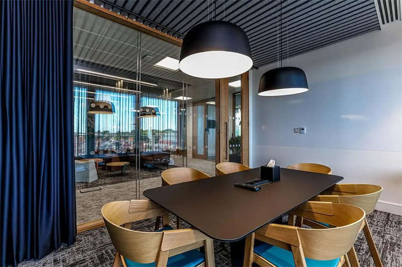 照明方案采用了多種光照的組合形式,以創(chuàng)建自然日光的感覺。對于技術(shù)部門來說,重要的是照明不能太高科技感或像一個(gè)大燈箱,因此這里使用了軌道照明代替漫射器和聚光燈。會(huì)議室以吊燈為主,突出與會(huì)人員的面部照明,以及屏幕上方用于遠(yuǎn)程通話的燈光,因此,需要更專業(yè)的照明設(shè)計(jì),以清晰、明亮的映襯和傳遞人物形象。