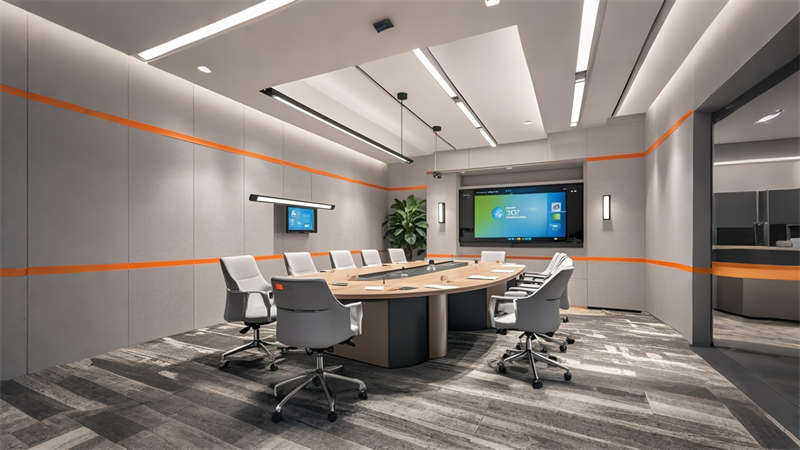 本項目為1800㎡現代簡約風格辦公室整體設計,以 ' 高效?活力?互聯 ' 為核心設計理念。空間規劃采用動靜分區原則,前廳通過淺灰大理石與橙色 logo 的碰撞凸顯企業形象,開放辦公區運用玻璃隔斷保證采光與交流效率。色彩體系以企業標準色淺灰為主調,搭配活力橙點綴,木色中和冷峻感。材質選用環保型穿孔鋁板、防滑地磚和 E0 級板材,集成智能會議系統和隱藏式線管設計。重點空間如高管辦公室采用深胡桃木提升質感,休息區通過波浪吊頂和模塊沙發營造輕松氛圍。照明系統采用 4000K 色溫 LED 線型燈帶,搭配局部裝飾吊燈,確保工作照度與空間美感平衡。全案貫徹人體工學設計,預留 20% 彈性空間適應未來發展需求。