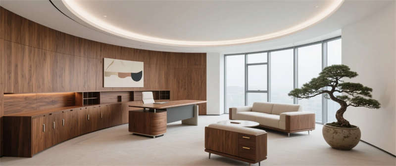 以低飽和度色系為視覺基底,現(xiàn)代極簡主義與自然生態(tài)理念在此交融,構建兼具理性效率與情感溫度的辦公場域。通透的玻璃幕墻將城市天際線引入室內,前廳接待區(qū)以深褐大理石與抽象金屬裝置傳遞企業(yè)質感,垂直綠植墻模糊建筑與自然的邊界。開放式辦公區(qū)以模塊化家具與弧形書架創(chuàng)造靈活動線,透明天窗將日光轉化為流動的創(chuàng)作能量,幾何聲學板在靜謐中守護協(xié)作靈感。