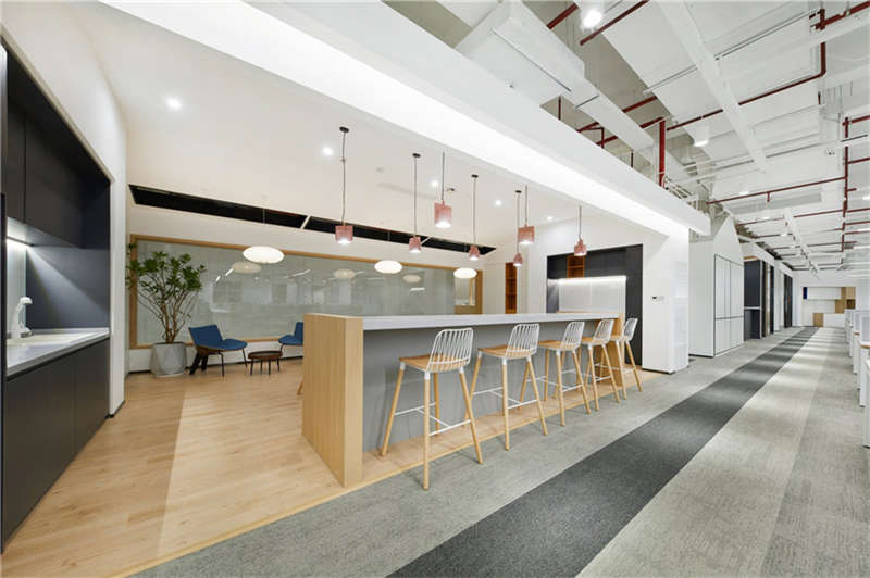工位數量需求雖然龐大,但甲方對多元化的功能區的需求并未減少。于是我們將咖啡吧、茶水間、休閑區這幾個功能進行融合,破除了空間的界定,將水吧區打造成一個開放性的多功能區域,賦予它全新定義,從而達到滿足員工的一系列休閑目的。