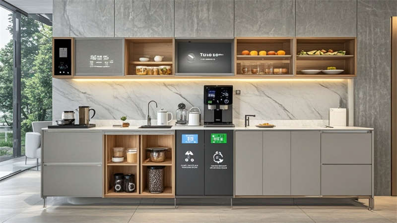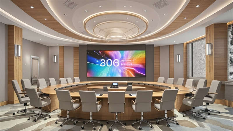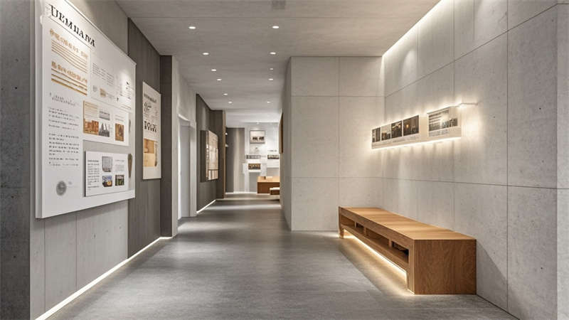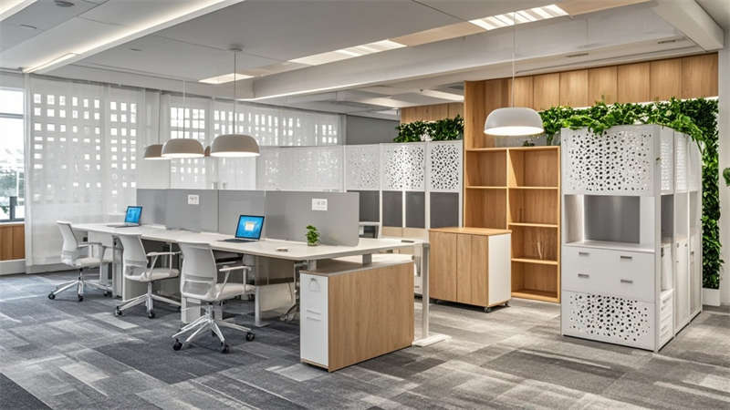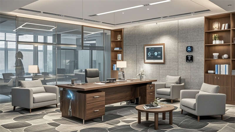 ④聲學(xué)吊頂確保35分貝以下靜音環(huán)境。色彩搭配采用70%淺灰奠定基調(diào),20%原木色增添溫暖,10%企業(yè)藍(lán)作為點睛色。環(huán)保方面選用LEED認(rèn)證材料,集成光伏玻璃幕墻年發(fā)電量達(dá)8萬度。