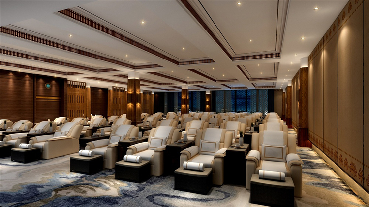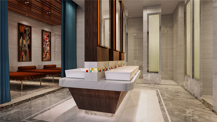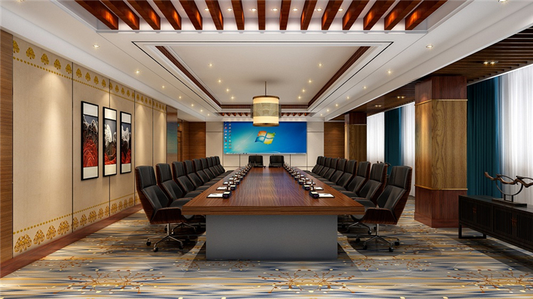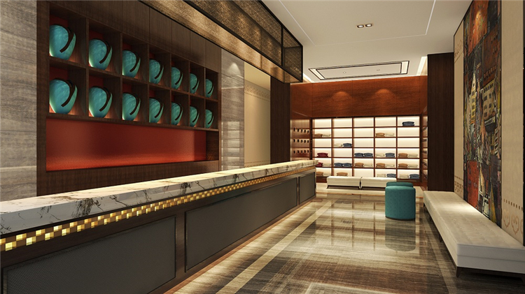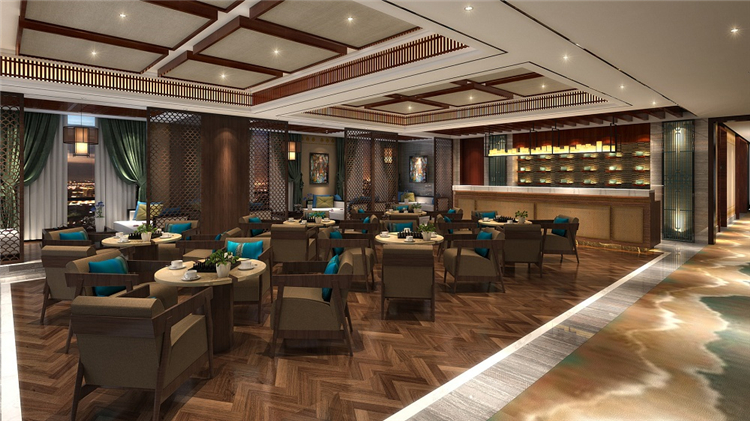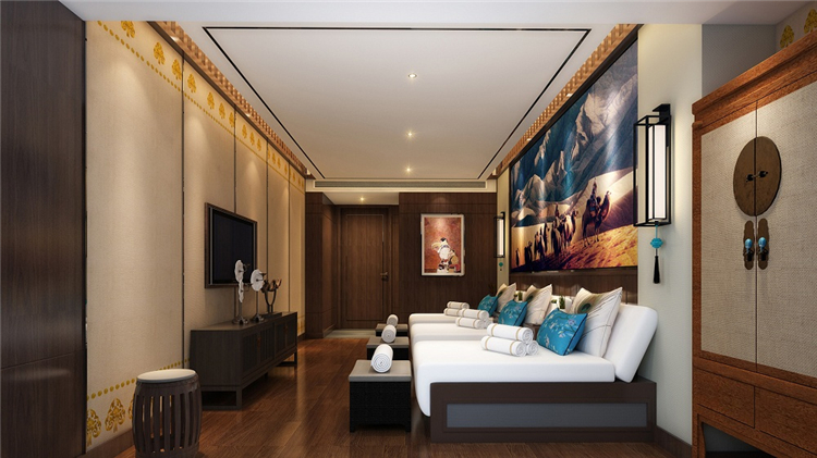 設(shè)計師同時考慮到地域民族文化和功能實用性,結(jié)合現(xiàn)代簡約與傳統(tǒng)藏式風(fēng)格,為往來的游客提供一個放松休憩的完美場所。設(shè)計師主要運(yùn)用藏藍(lán)、金黃、喇嘛紅等濃重色彩進(jìn)行搭配,靈感既來自于藏族傳統(tǒng)文化及宗教藝術(shù),也來自于雪域高原山高天藍(lán)水長花艷的自然景觀。借用柱網(wǎng)結(jié)構(gòu)、幾何紋路、吉祥花等藏式建筑形式和圖案進(jìn)行裝飾和點綴,但將繁復(fù)的式樣盡量精簡平面化,取其古樸、神奇、粗獷的神韻,表達(dá)一種平衡、對比、和諧統(tǒng)一的構(gòu)圖規(guī)律和審美思想。