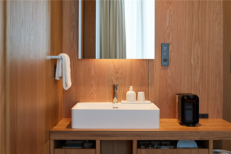 總共79間客房中,最緊湊的客房橫寬僅有2.1米。在這細長房間內,配置了讓旅途疲憊者身心徹底放松的元素。如設置了符合人體工學的床墊,觸感柔軟的浴巾,柔和溫馨的照明等,營造了超乎尋常的舒適空間。