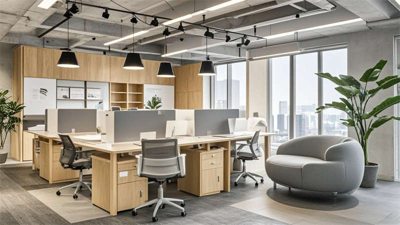 辦公區采用模塊化布局,配置智能升降桌和人體工學椅,裸頂噴灰工藝結合軌道燈系統實現靈活照明。色彩體系以高級灰為基底,搭配原木色系緩解視覺壓力,局部采用深藍跳色增強空間層次。材質運用注重環保性能,墻面大量使用穿孔吸音鋁板,地面采用防滑地膠與靜音地毯組合。