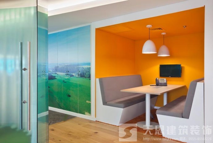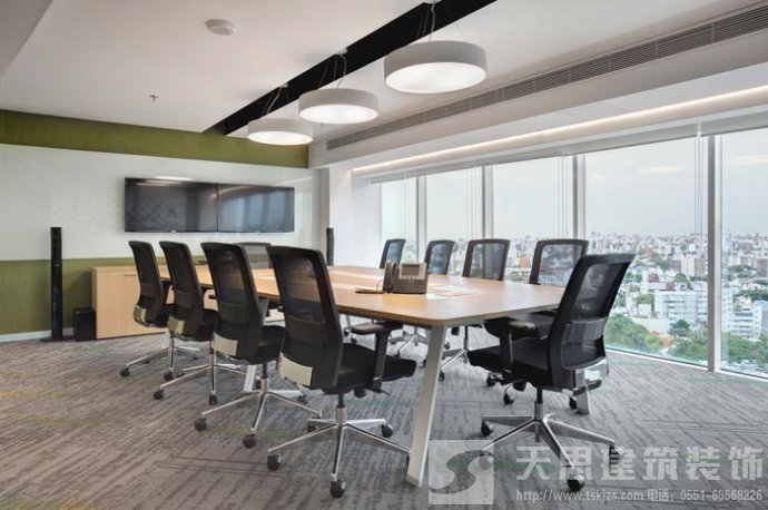 會議室的設計:設計師在設計的時候,將其安置在靠近窗戶的空間區域中,在設計師看來會議是企業發展所不可替的,但是設計師希望可以改變會議室給人枯燥、無味的感覺,故此設計師將采光、室外景色通過設計的手法將其引入室內,讓會議變得有趣起來。