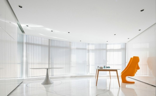 一般來說,董事長或者總經理辦公室桌椅用紅色木質的,朱紅色的辦公桌和白色的吊頂搭配非常的和諧,給人一種非常沉穩、大氣的感覺。吊頂造型上要具有創意,有一定的獨特性,例如由幾個圓環形組成的,就會顯得非常的大氣,象征著公司業務的完美開展。