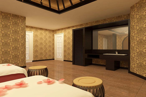另外東南亞風(fēng)格的SPA間則采用了較深的木色擦色做漆,并且做了東南亞風(fēng)格的吊頂。