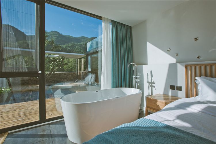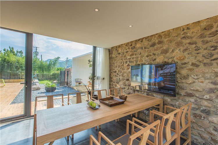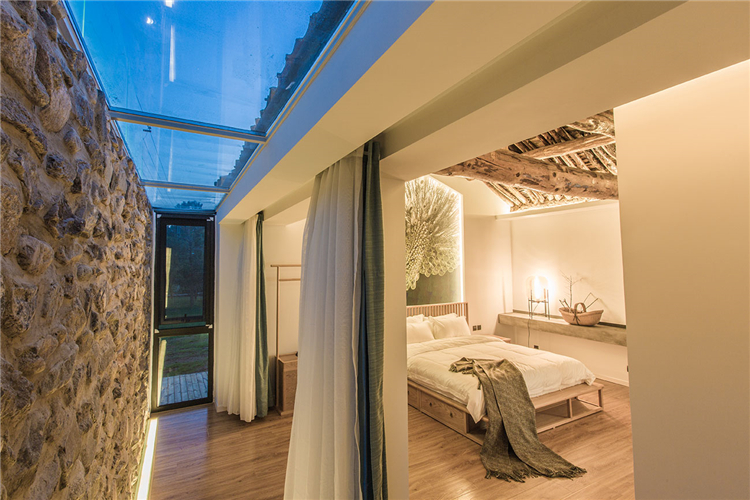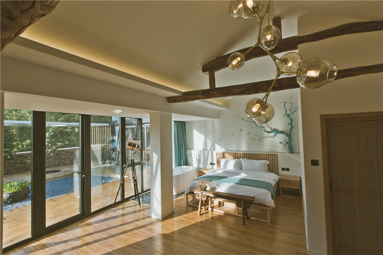 “隨著越來(lái)越快的生活節(jié)奏我們每天奔忙,每天遺忘城市越來(lái)越近,鄉(xiāng)村卻越來(lái)越遠(yuǎn)”。這所名為“畫框里”的民宿位于水泉子村,而名字寓意為將百里畫廊的山水美景留在畫中院中。可看到名副其實(shí)靈動(dòng)的山水畫這四季的變幻,凝集了我們對(duì)生活所有的向往。落地窗邊放置了浴缸做一個(gè)泡泡浴一眼望去是院落的美景和遠(yuǎn)山的意境。主臥空間很寬敞,新中式的原木配灰色的簡(jiǎn)易家具些許的現(xiàn)代元素金屬攝影燈使房間內(nèi)多一份輕松感。