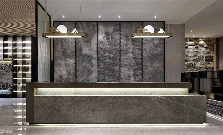 酒店在不同層次的設計上靈活運用了徽州文化的核心特點來汲取神韻氣質,結合空間的整體系列性,將文化元素滲透到每一個細節中,將經典重現.營造極具東方美學觀感的藝術空間.設計團隊通過對傳統與現代結合,含蓄與精致并存,兩種不同意境相映成輝,從文化底蘊、材料、軟裝色彩......去推敲空間的序列,實現了酒店的魅力.既體現出人們對當代藝術與文化的追求,又勾勒出東方意境的沉穩靜謐.