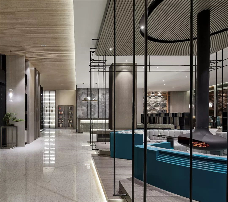 傳統與現代的融合變通,通過汲取傳統徽派的木構斗拱、瓦片、留白的山墻和民居的水墨意境,運用新的材料進行演繹,如水磨石的地面、背景墻藝術圖案結合金屬網、半透的夾絲玻璃、黑色的金屬構建.以寫意的方式提取徽州的意境,延續徽派建筑的黑白兩色,再點以中國傳統色系軟裝搭配,表達了設計對傳統的回歸和未來的展望.