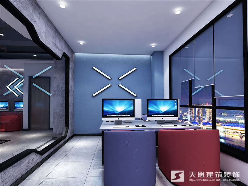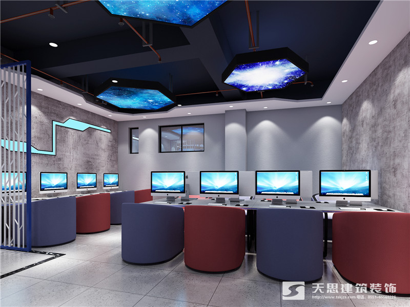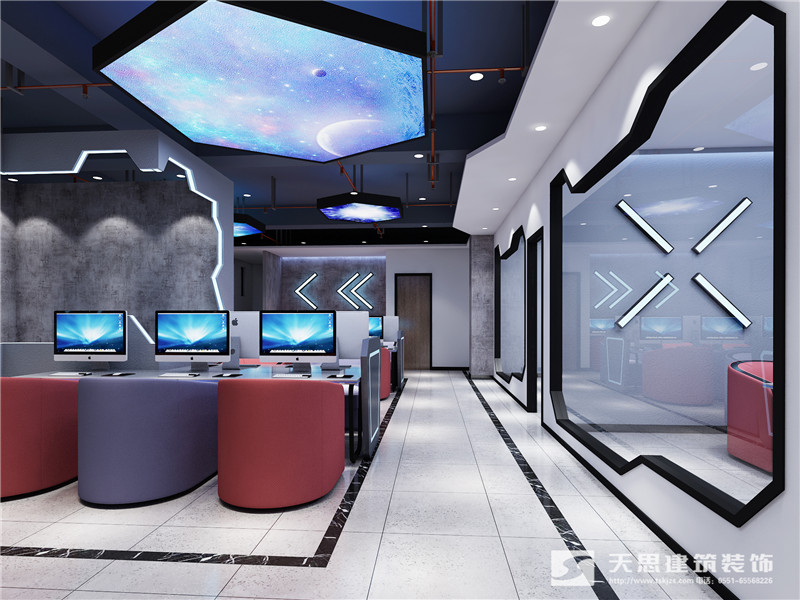 根據(jù)業(yè)主的要求,網(wǎng)咖設計的整體顏色以淺色為主,中間穿插對比強烈的撞色系來展現(xiàn)效果。