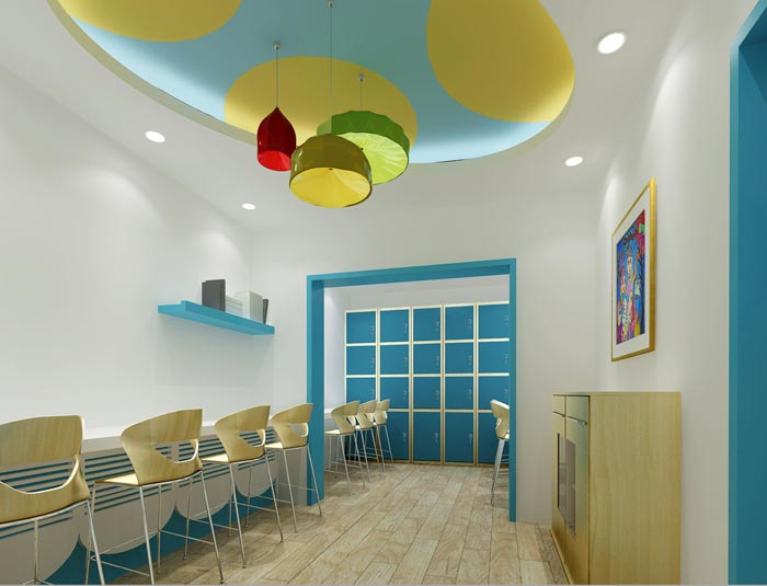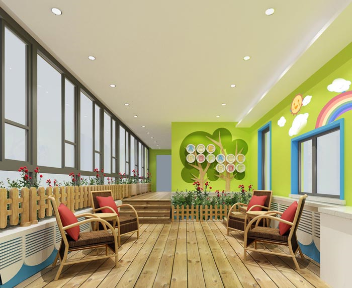 休息區域的設計:此處不僅可供教師休息,同時也可供孩子們在這里玩耍、娛樂,設計師的目的就是想讓大家在這里可以感受到陽光的溫暖,在此處陽光滲透到每一處空間,設計師希望陽光、自然可以掃清教師心中的煩躁,同時也給孩子更多的溫暖。