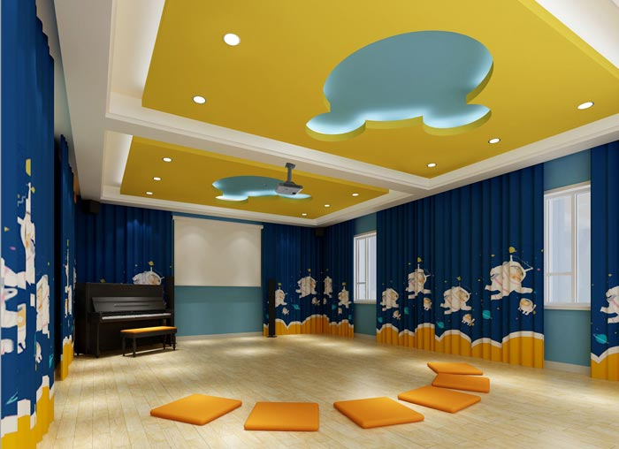 音樂教室的設計:對于每一個人來說,音樂都是美好的,對于孩子來說更是如此,當老師彈起鋼琴的時候,孩子們在后面翩翩起舞,無疑可以激發孩子們對于音樂的興趣,這里的一切都志在激發孩子的興趣,然后在興趣的指引下,達到教學的目的。