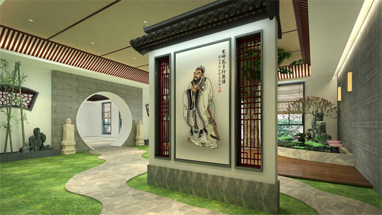 書法教育培訓機構進門區設計:文化的脈絡是字體,字體的脈絡是書法,書法的脈絡中隱藏著傳統的中華文化,通過對字體書法的研究,進入傳統文化的世界。至圣先師的畫像佇立在庭院的正中央,為空間增添了莊重之感,自然的景色更顯書法的飄逸與自然。