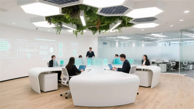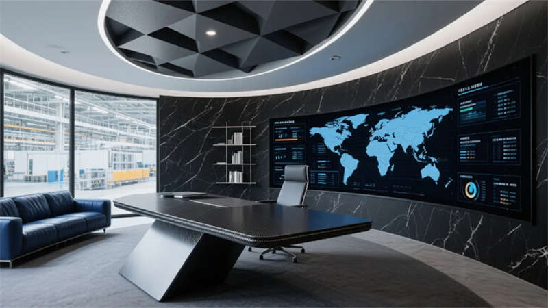 開(kāi)放式辦公區(qū)打破傳統(tǒng)壁壘,蜂窩狀工位與懸浮綠植裝置詮釋靈動(dòng)協(xié)作,透明屏幕上的數(shù)據(jù)流與玻璃隔斷投影的生產(chǎn)流程圖虛實(shí)相映。總裁空間則如懸浮的智慧中樞,弧形落地窗將車(chē)間全景化作動(dòng)態(tài)壁畫(huà),金屬與大理石的碰撞間,流淌著決策與創(chuàng)新的電流。智能倉(cāng)儲(chǔ)區(qū)立體貨架的金屬骨骼間,無(wú)人機(jī)如蜂鳥(niǎo)般掠過(guò)貨品,天光與電子標(biāo)簽的光斑在環(huán)氧地面上跳動(dòng)著數(shù)字時(shí)代的韻律。