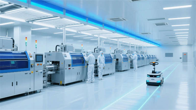 這個(gè)潔凈車(chē)間廠房,以未來(lái)工業(yè)美學(xué)為語(yǔ)言,詮釋新能源智造的全新范式。通透的玻璃幕墻與菱形光伏屋頂交織,將自然光引入車(chē)間,與冷調(diào)LED光帶共構(gòu)科技與生態(tài)的平衡。核心生產(chǎn)區(qū)如同精密運(yùn)轉(zhuǎn)的“硅基心臟”,層流送風(fēng)系統(tǒng)無(wú)聲守護(hù)著無(wú)塵環(huán)境,自動(dòng)化設(shè)備在藍(lán)色光暈中有序協(xié)作,AGV穿梭的軌跡編織出無(wú)聲的效率詩(shī)篇。