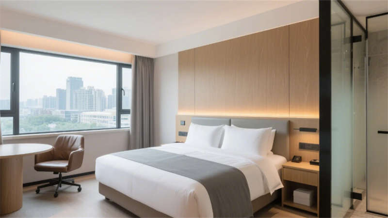 客房區域強調“靜謐中的科技感”,標準間通過木飾面隱藏燈帶與霧化玻璃衛浴實現功能與美學的平衡;全景套房則以180度落地窗引入自然景觀,臨窗圓形浴缸與雙臺盆設計重新定義奢華體驗。