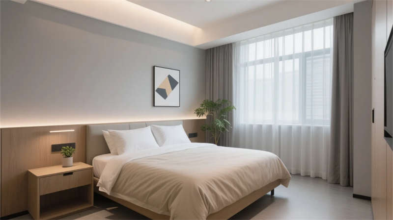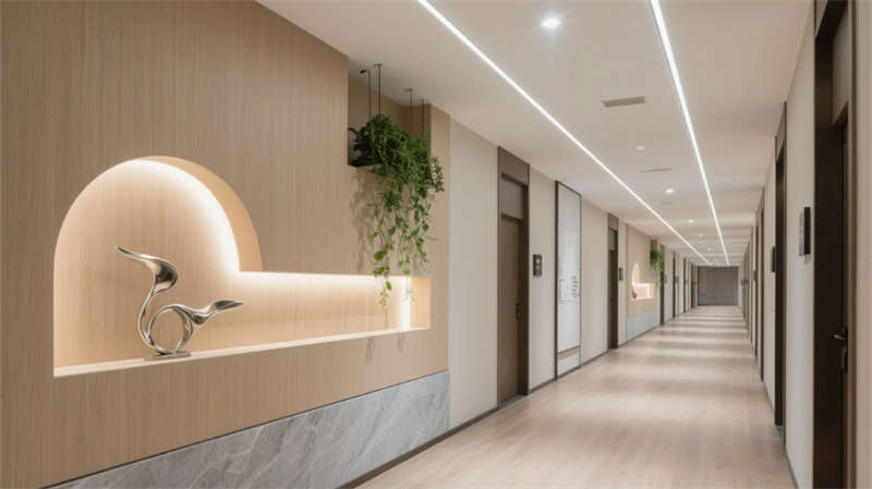 酒店以現代簡約美學貫穿始終,走廊作為串聯各區域的紐帶,延續了整體的設計語言?;⌒伪邶惻c懸浮天花板的線性燈光,柔和地引導動線,淺木飾面與石材的碰撞在低調中彰顯質感。壁龕內的藝術擺件與垂墜綠植,將自然氣息融入過渡空間,打破傳統走廊的單調感。