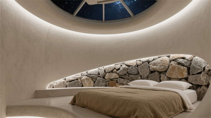 功能布局巧妙銜接室內外呼吸感:接待廳玻璃幕墻引竹林入畫,禪茶室借枯山水凝神靜氣;餐廳與書吧以可移動家具實現場景轉換,暗藏式光源在夜間描摹空間輪廓。客房設計強調私密療愈,星空穹頂與混凝土浴缸形成原始與現代的詩意碰撞。