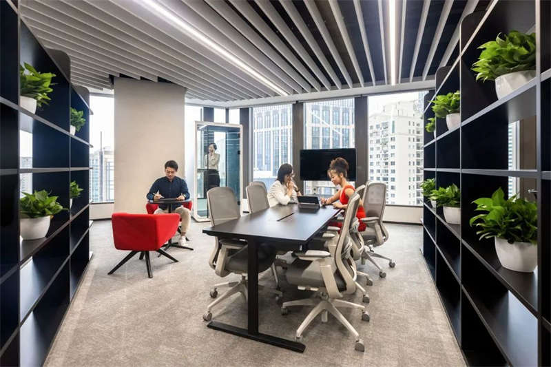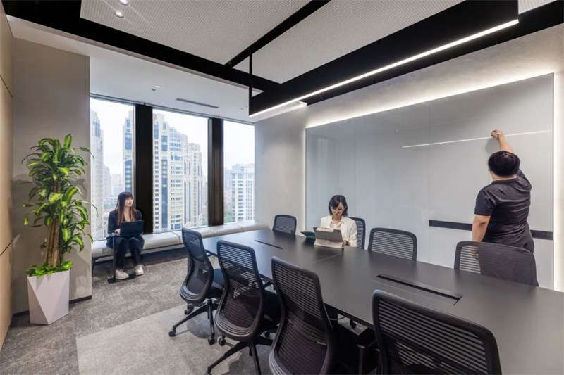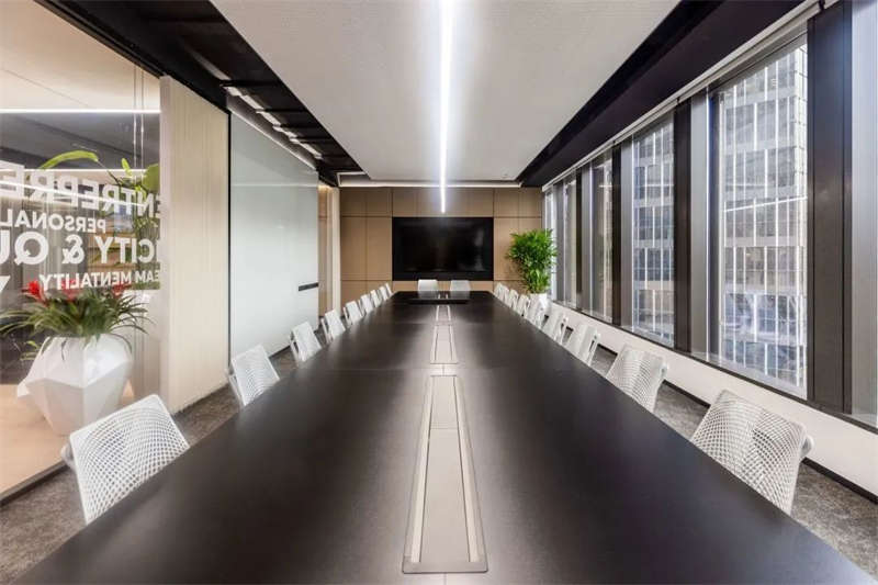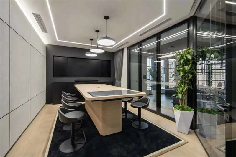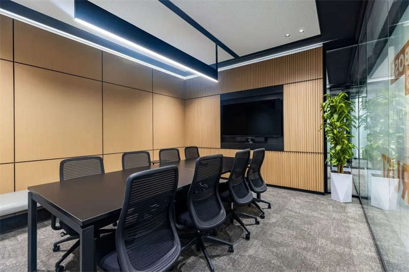 所有的會議室中,電視屏背景墻均以縱橫相交的豎條黑色U形槽做了分塊處理,在電視屏幕安裝位置上保持了統一原則,電視屏垂直居中,上下線條與背景墻上部、底部的距離相等。諸如此類的設計,使得辦公空間視覺條理性得到了加強。