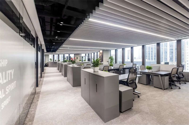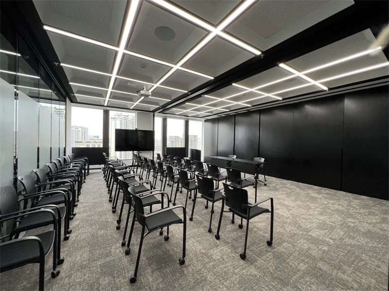 前臺區的兩條燈帶從吊頂延伸至側墻體底部,光源自上而下具有連貫性。培訓室縱橫燈帶分割出的塊狀吊頂間,在施工時做了整齊對接的處理,以此增加空間的秩序感。齊整化的處理,凸顯出辦公空間嚴格的秩序性。