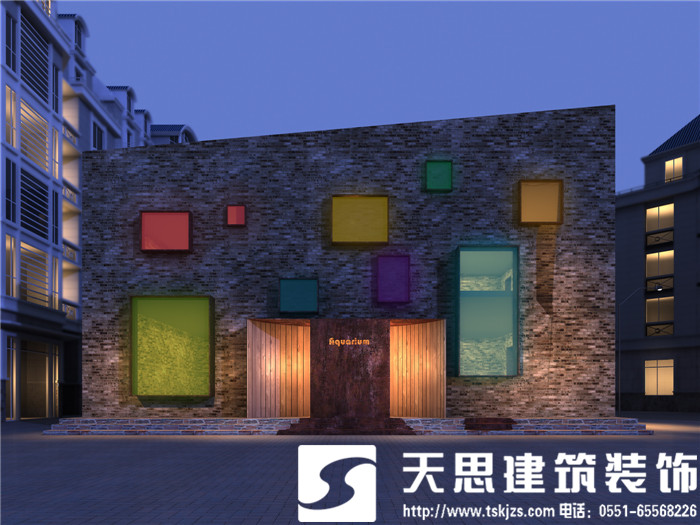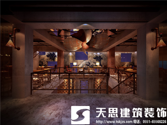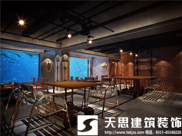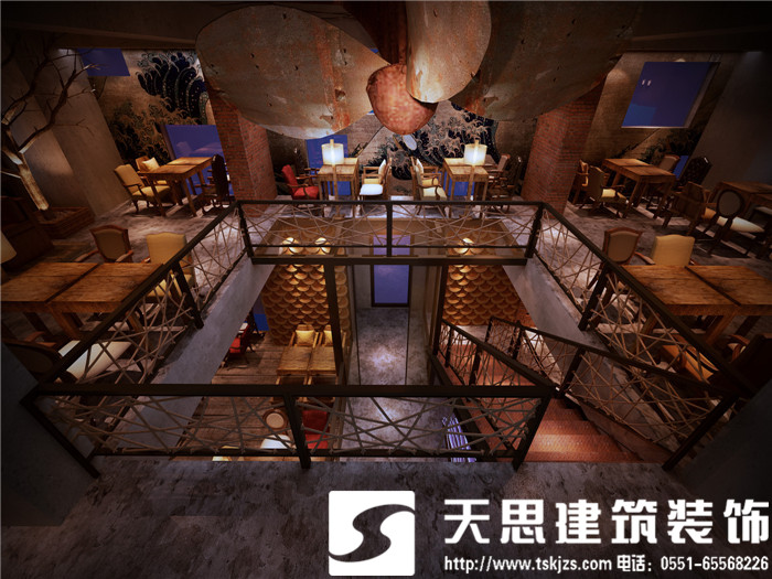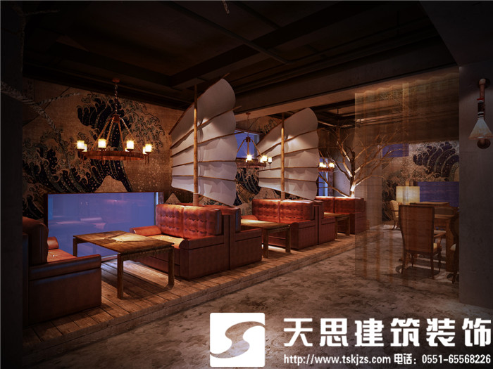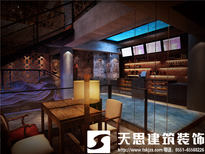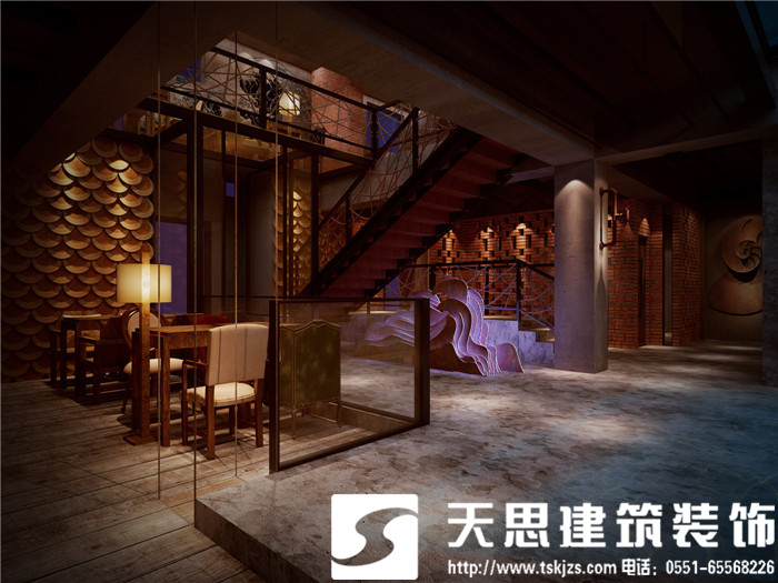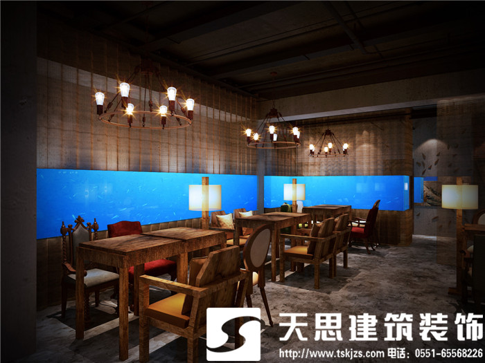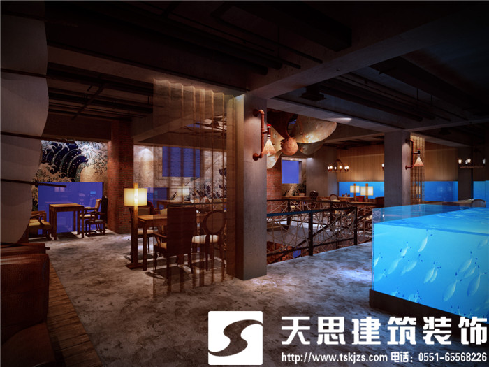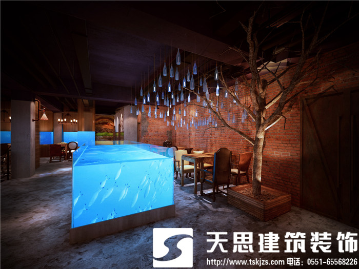 設計師讓空間呈現對話關系,彼此呼應。二層的長方形水族魚箱,在一樓即為吧臺頂層的雅致裝飾,自然傾瀉的燈光給吧臺區足夠的光源,簡約環保的理念貫穿在空間設計里。節次鱗比的魚鱗造型墻飾,富有藝術感,特用原木制作,將韻味進一步升華。