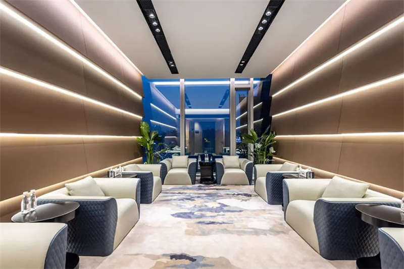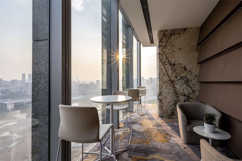 此辦公場所融合行業范式、藝術、辦公、會客和休閑功能,豐富的城市景觀與奢華的家具用材將空間美學統一起來,落地窗獲得更多明亮場域,空間通透舒朗,客戶進入空間能感受到簡潔明亮的氛圍。