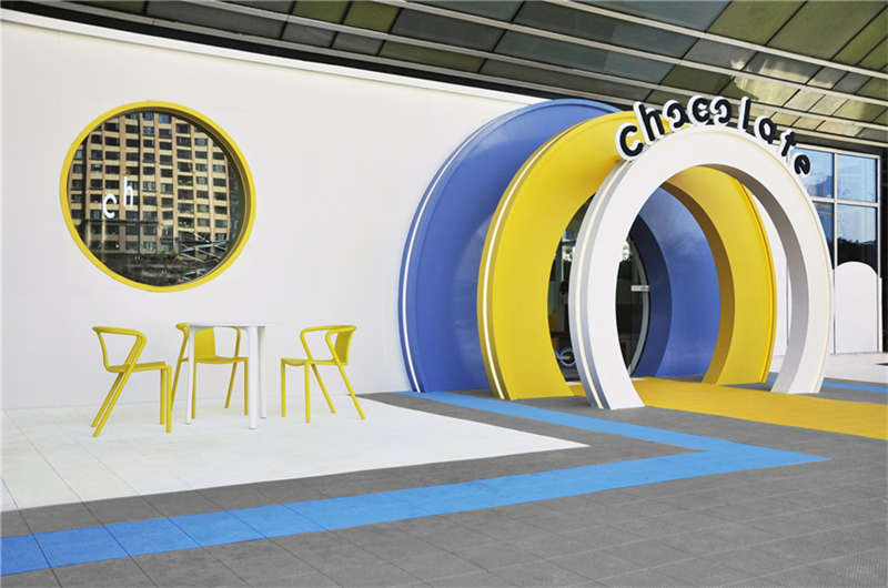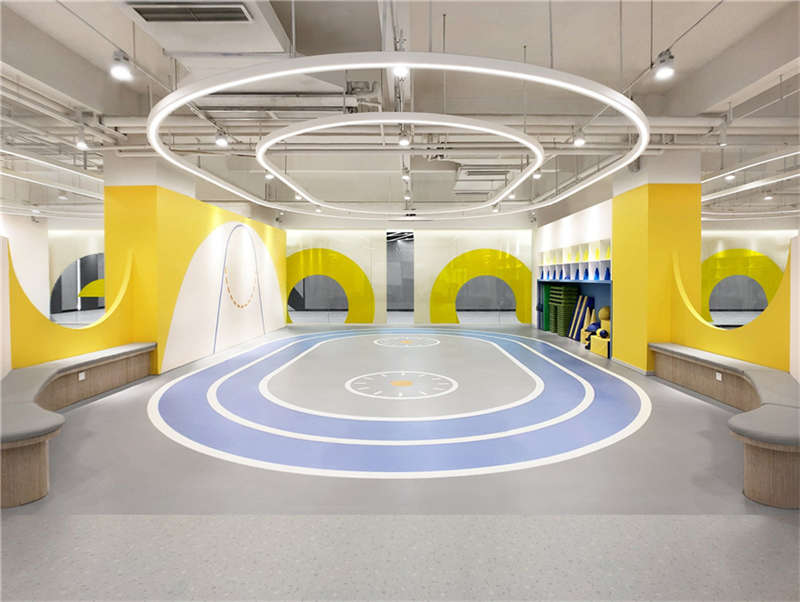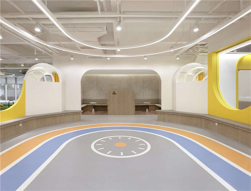 利用樓宇的縱向夾角空間,層層疊出的形象是進入星球的能量加速器。地上的黃色跑道是孩子們丈量自己成長的T臺,每個小朋友通過跑道后都擁有更強的生命力。緊鄰接待區的泡泡池是迎接孩子們的歡樂地,背后的鏡面構筑了游離在現實與夢境之間的界限,折射出孩子更加廣闊的天空,讓能量加倍!