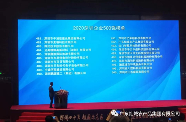 10月20日,深圳市企業聯合會、深圳市企業家協會發布“2020深圳500強企業”,廣東燦城農產品集團有限公司榮膺“2020深圳500強企業”,位列第492位,充分彰顯了燦城農產品集團在深圳企業及農產品配送行業的綜合競爭實力和良好發展趨勢。