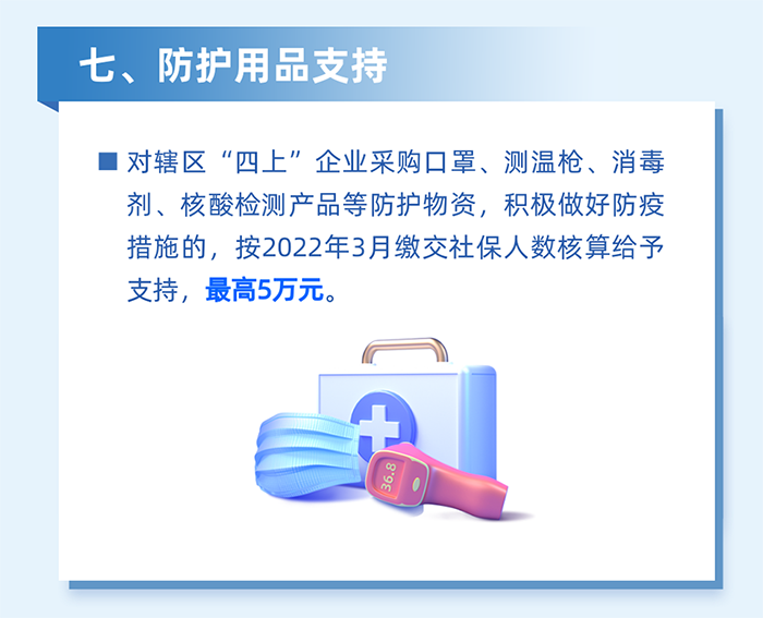 減輕企業防疫負擔。對為員工采購口罩、測溫槍、消毒劑、核酸檢測產品等防疫用品,以及應用檢測試劑、防疫醫療設備、智能測溫、數字化信息采集、無人車等數字防疫設備的區四類百強企業,按2022年3月實際繳納失業保險人數給予100元/人的補貼,單家企業最高20萬元。(牽頭單位:區工業和信息化局、科技創新局)