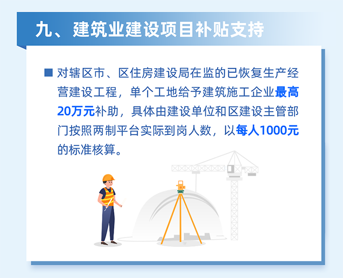 7.南山區范圍內已開工的工程項目,于2022年3月12日至2022年3月31日期間,因配合疫情防控工作需要被實施封閉式集中管理的,按集中居住在生活區的勞務工人人數,以1000元/人的標準,給予施工總承包單位補貼。(責任單位:區住房建設局)