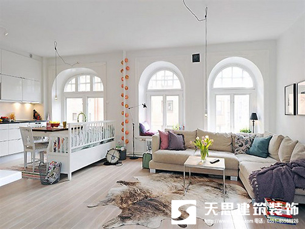 在華麗的水晶燈的照耀下,白色的北歐客廳裝修設計顯得清新亮麗,輕盈的塑料茶幾在柔軟的地毯上放縱的舞蹈,彩色的靠枕和墻紙是北歐客廳裝修的唯一色彩,藍花的壁紙烘托出北歐客廳的溫馨氣氛。