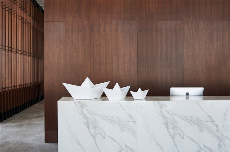 大堂和餐廳的內(nèi)部特色是光滑的白色石膏墻壁、大理石、黃銅和深色的木材家具。這里用了一個(gè)白色,純凈,簡單的立面,走進(jìn)里面,仍然會(huì)感覺到白色,但同時(shí)我們使用了一些其他的材料。所有的顏色都來自真實(shí)的材料,讓你進(jìn)入室內(nèi)時(shí)更溫暖。