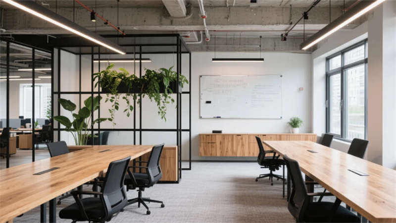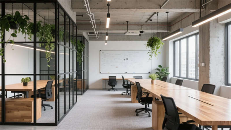 該辦公空間以暖調輕工業風為靈魂,將冷峻的金屬骨架與溫潤的竹木元素交織,在微水泥的灰調基底上鋪陳出理性與感性的平衡。開放辦公區借落地窗引光入室,綠植墻與軌道燈串聯起流動的協作場景;獨立專注艙與水吧區形成動靜分區,滿足深度思考與即時社交的雙重需求。