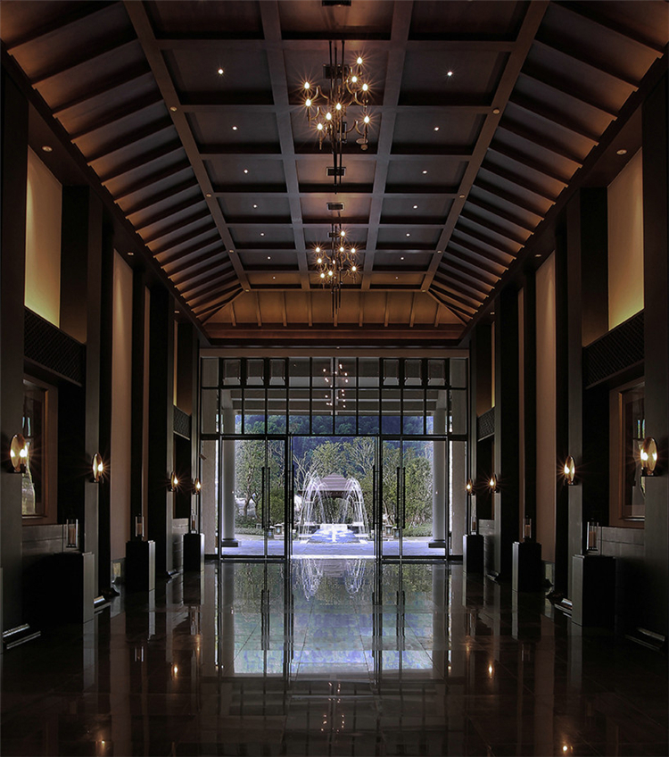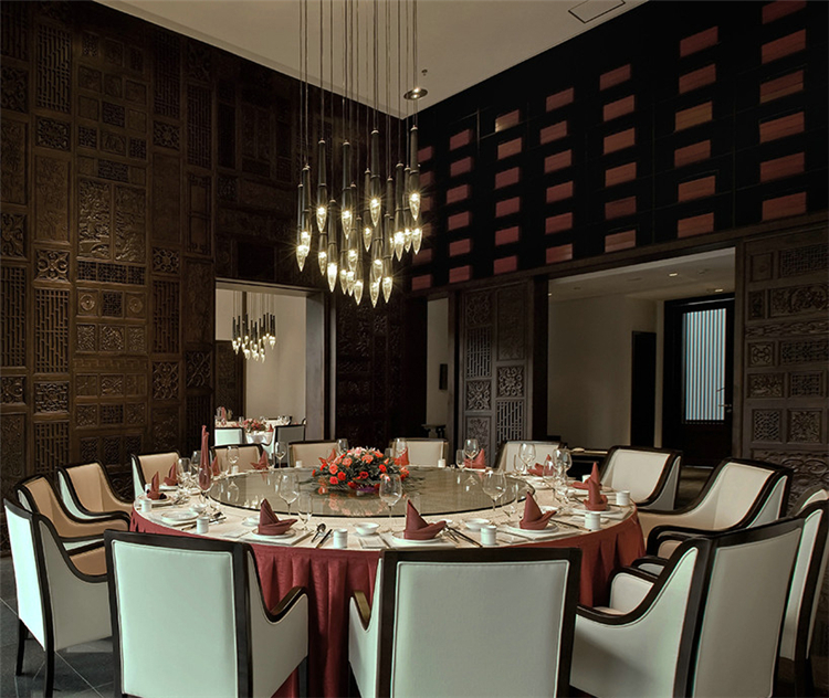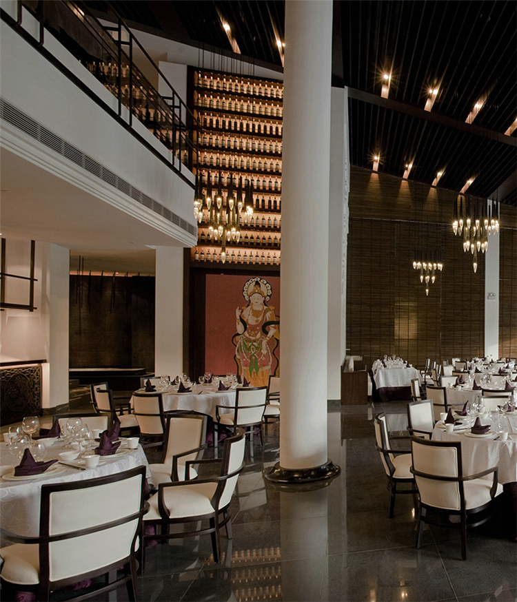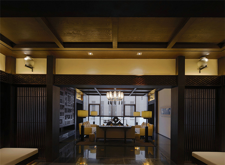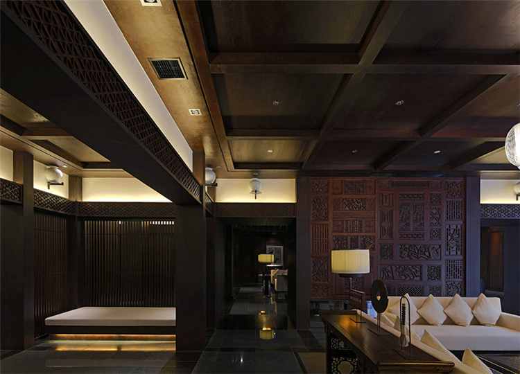 穿過悠長的走道,在灰白色空間配合溫暖沉著木色格子窗棱,讓客人逐步感受一種優(yōu)雅的熱情。天花的黑色線條設(shè)計,帶有極強(qiáng)的導(dǎo)向性,墻面上特別設(shè)計的壁燈,與柱體結(jié)合,極大地豐富整個空間的層次感和趣味性。