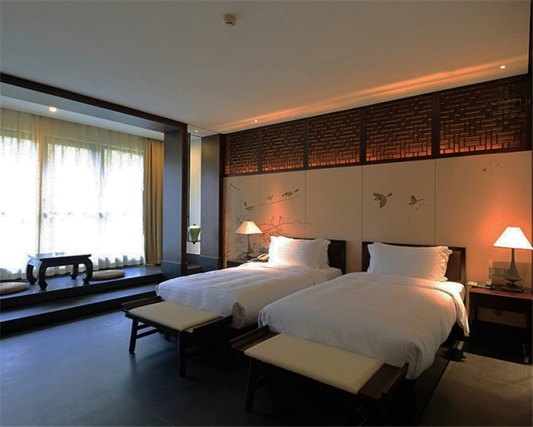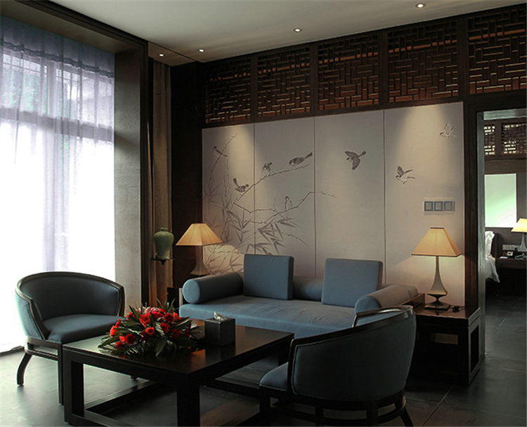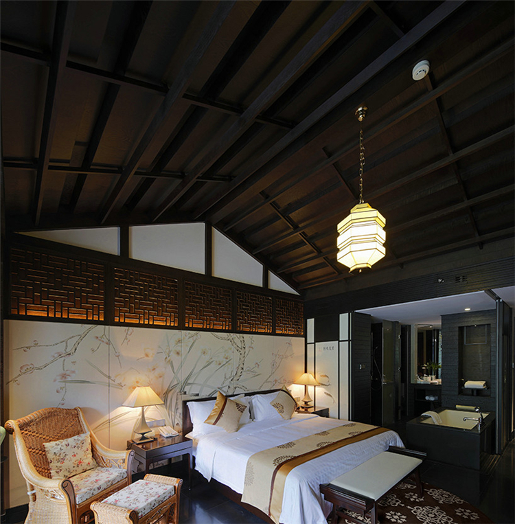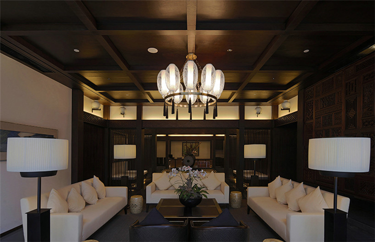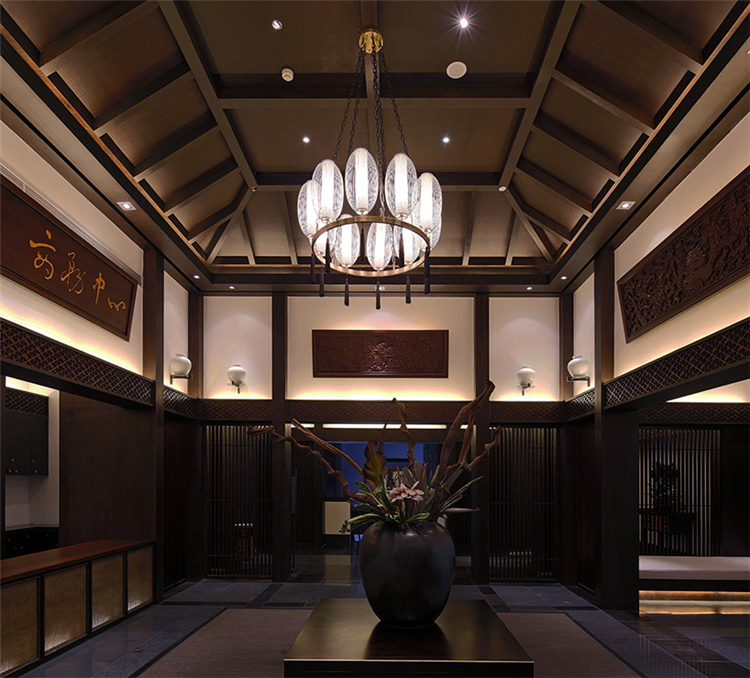走入大堂,室內(nèi)空間寬闊,天花鱗次櫛比通向樓梯方向,墻面灰色石材雕刻,將桃花源記中的詩句映入客人眼簾,禪境古意撲面而來。鏤空屏風(fēng)隔墻的設(shè)計,讓空間隔而不斷,與具有傳統(tǒng)韻味的家具和配飾相互交融,打斷俗世的紛擾。柱子和天花上的裝飾燈具,利用金屬和木材兩種截然不同的材料和質(zhì)地,創(chuàng)造空間內(nèi)在張力,透過銳利的金屬、細(xì)膩的木質(zhì)線條強(qiáng)調(diào)空間結(jié)構(gòu),精致筆挺的吊燈,令空間由內(nèi)向外展現(xiàn)獨特魅力。