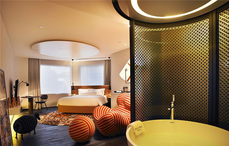極簡主義風(fēng)格并沒有妨礙設(shè)計師為酒店創(chuàng)造豐富的主題元素,以花草、猴子、孔雀、青蛙等為主題的森林圖案,遍布鏡面、墻壁等區(qū)域,營造了精致的“城市森林”效果。