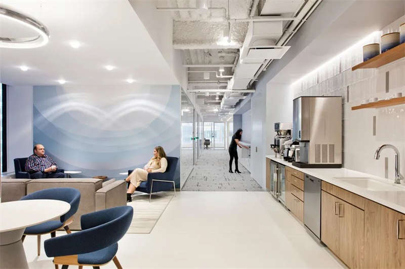 設(shè)計(jì)以明亮極簡的配色和獨(dú)特的材質(zhì)肌理,將公司的品牌形象系統(tǒng)詮釋于空間設(shè)計(jì)中。由白色大理石所營造的開敞明亮的空間感,由電梯廳一直延伸至室內(nèi)大廳,并溶于白色、淺灰和藍(lán)色所共同營造的輕盈靈動(dòng)的環(huán)境背景中。