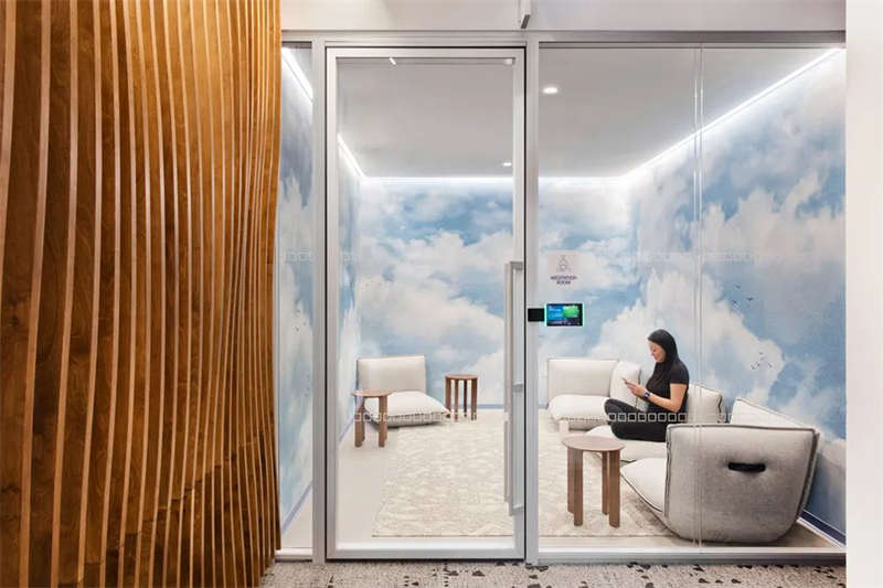 協(xié)作區(qū)域穿插分布于工作站和獨(dú)立辦公室之間,以創(chuàng)建通向多個(gè)體驗(yàn)區(qū)域的路徑。這包括眼科室、音樂室、冥想室和閱讀休息室等空間,所有這些空間都是出于健康的目的而設(shè)計(jì)的,以改善和提高員工的工作方式。