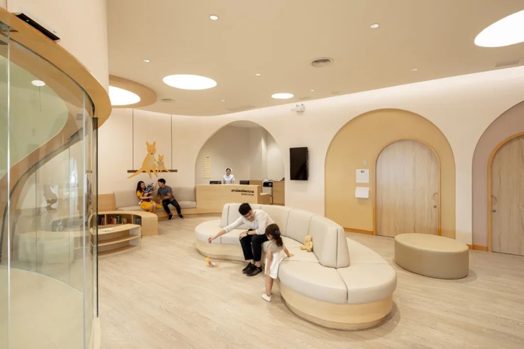 對于生病的孩子來說,富有趣味的內飾才是關鍵,拱形門框讓看病成為一場趣味探險,消除了孩子與醫生間的隔閡。醫院的一樓和二樓都有兒童游戲區域,原本對于家長和孩子來說十分難熬的候診時間,便可以在這里悠閑的度過。當然醫院內也有專門的等候空間,不同于以往醫院中冷冰冰的不銹鋼座椅,柔軟的觸感、彎曲的造型都十分人性化。